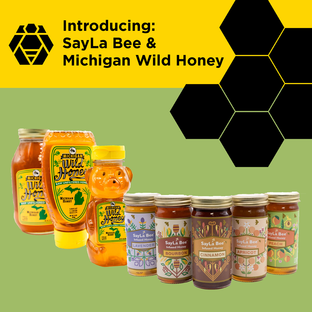 Continuing our celebration of National Honey Month this September, let’s properly introduce our two latest Michigan-made honey collections, SayLa Bee Infused honey, and our new brand of raw, unfiltered Michigan Wild Honey – both hand bottled right at the Great Lakes Bee Company facility in Fremont!